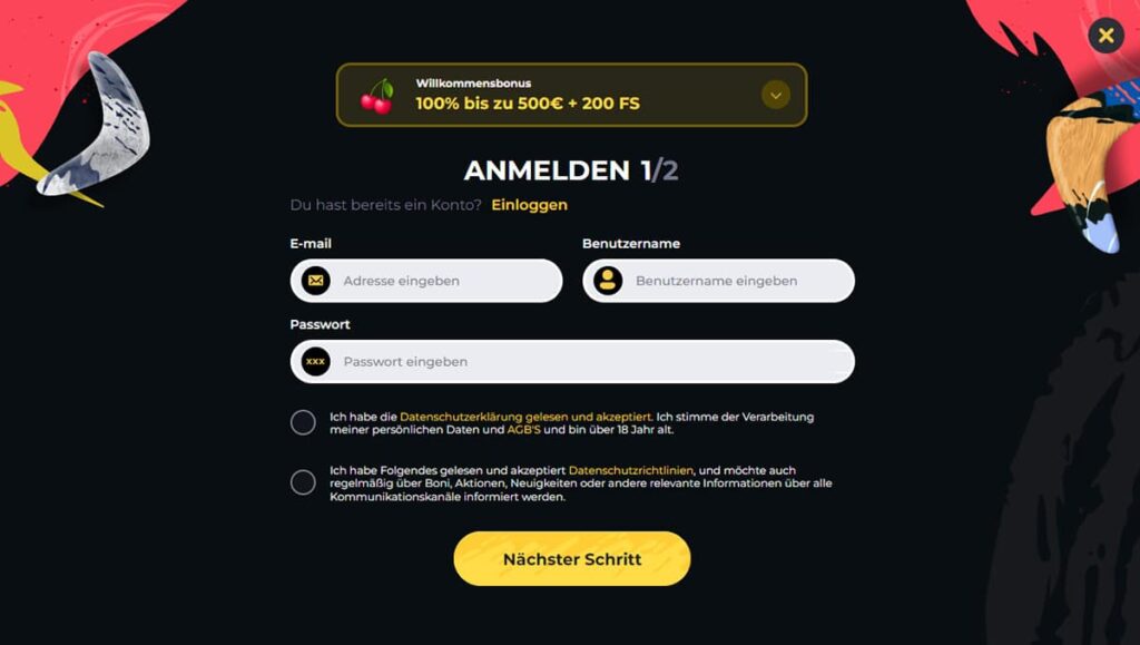 1️⃣ Offizielle Website aufrufen – Die Boomerang Casino-Seite öffnen und auf „Registrieren“ klicken.