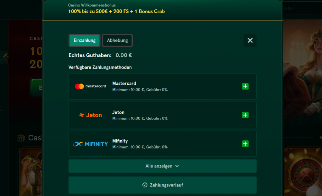 • Mindesteinzahlung und -auszahlung: Die Beträge für Ein- und Auszahlungen variieren je nach Methode, bewegen sich aber meist im Bereich von 10–20 €. Höhere Limits sind für VIP-Spieler möglich.