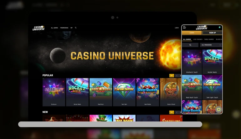 Casino Universe ist das moderne Online Casino für deutsche Spieler! Hier erwarten dich ein großzügiger Willkommensbonus, Freispiele ohne Einzahlung, schnelle Auszahlungen und ein breites Spielangebot von Slots bis Live Casino. Mit sicherer Lizenz, einfacher Registrierung und mobilem Zugang ist Casino Universe Online Casino die perfekte Wahl für alle, die Spannung, Seriosität und Top-Boni in einem Paket suchen.