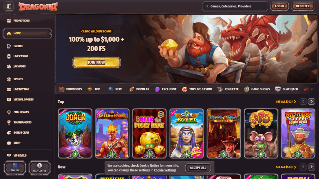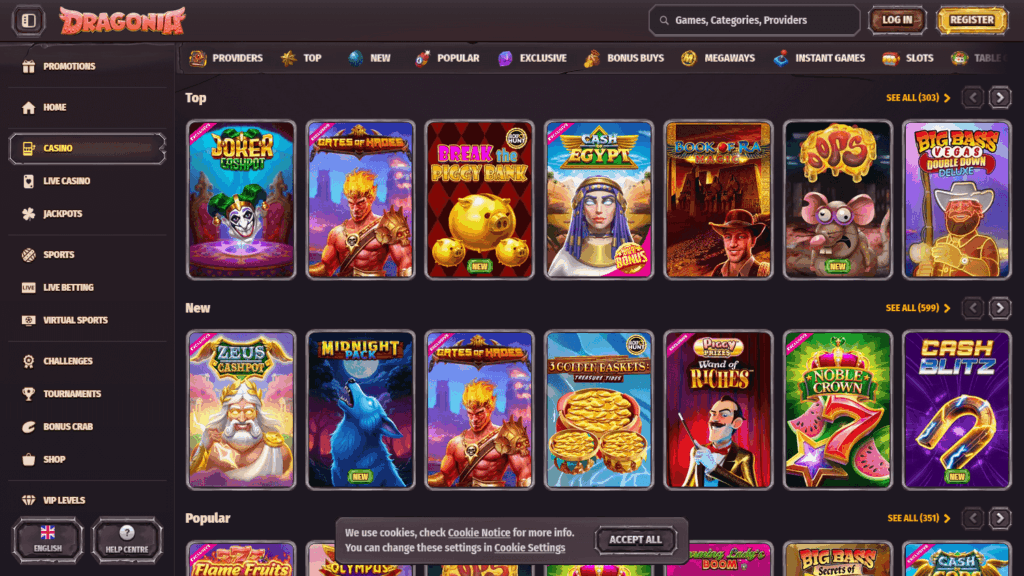 Das Dragonia Casino begeistert mit einem umfangreichen Spieleportfolio, das sowohl Einsteiger als auch erfahrene Spieler überzeugt. Dank der strukturierten Navigation, der klaren Spielkategorien und der schnellen Ladezeiten ist es besonders einfach, das passende Spiel zu finden – ob klassischer Automat oder modernes Live-Erlebnis.