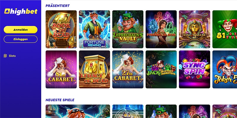 Das HighBet Casino bietet eine breite Spieleübersicht mit Slots, Tischspielen, Live Casino und Sportwetten.