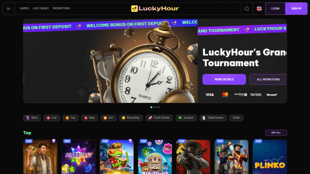 LuckyHour Casino bietet eine klare, benutzerfreundliche Oberfläche, die sich von anderen Casinos abhebt. Die Navigation ist intuitiv, sodass Sie schnell zu Ihren bevorzugten Spielen gelangen. Alle Spiele sind in übersichtliche Kategorien unterteilt, die eine schnelle Auswahl ermöglichen.