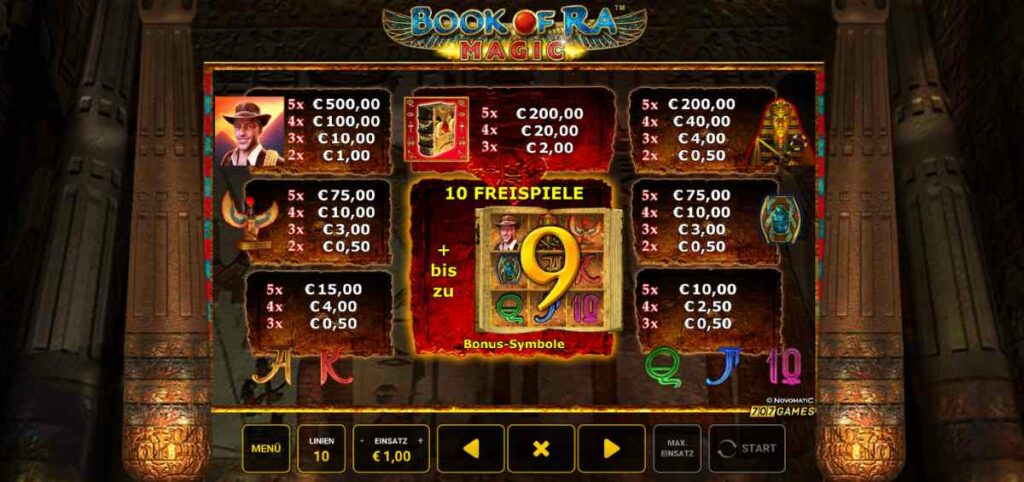 Um eine Auszahlung zu erzielen, müssen mindestens drei identische Symbole auf einer aktiven Gewinnlinie erscheinen. Die wertvollsten Symbole sind der legendäre Abenteurer, die Pharaonenstatue und das goldene Buch, während die klassischen Kartensymbole niedrigere, aber häufigere Auszahlungen bringen. Diese Mischung sorgt für eine ausgewogene Dynamik zwischen kleinen, stetigen Gewinnen und großen, selteneren Auszahlungen. Besonders interessant ist, dass im Book of Ra Magic Slot bereits zwei hochrangige Symbole für einen Gewinn ausreichen, was die Chancen zusätzlich steigert. Für Liebhaber von Online Casino Deutschland ist diese Kombination aus einfacher Mechanik und abwechslungsreichen Auszahlungen besonders attraktiv.