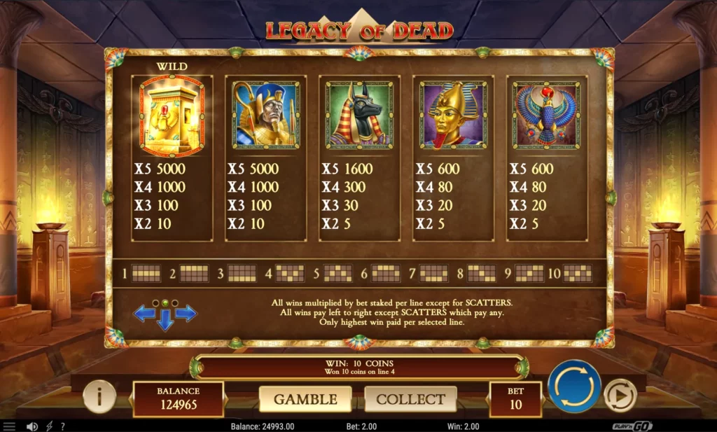Der Legacy of Dead Slot besteht aus 5 Walzen, 3 Reihen und 10 festen Gewinnlinien. Du kannst also nicht auswählen, mit wie vielen Linien du spielst – alle sind immer aktiv. Das sorgt für eine einfache Bedienung und klare Gewinnchancen.